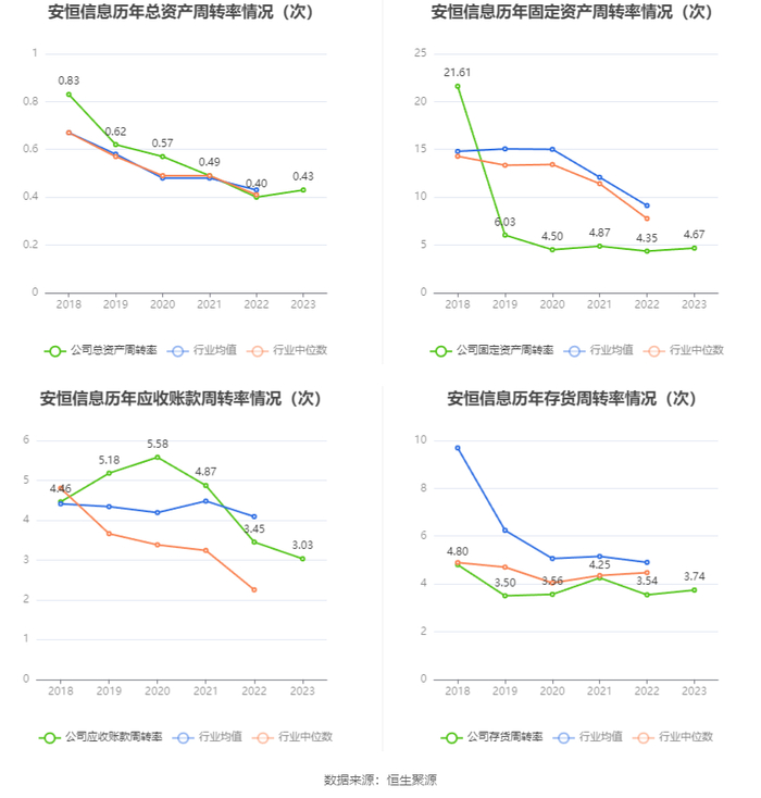 营运能力方面,2023年,公司公司总资产周转率为0.43次,上年同期为0.40次(2022年行业平均值为0.43次,公司位居同行业19/35);固定资产周转率为4.67次,上年同期为4.35次(2022年行业平均值为9.12次,公司位居同行业29/35);公司应收账款周转率、存货周转率分别为3.03次、3.74次。