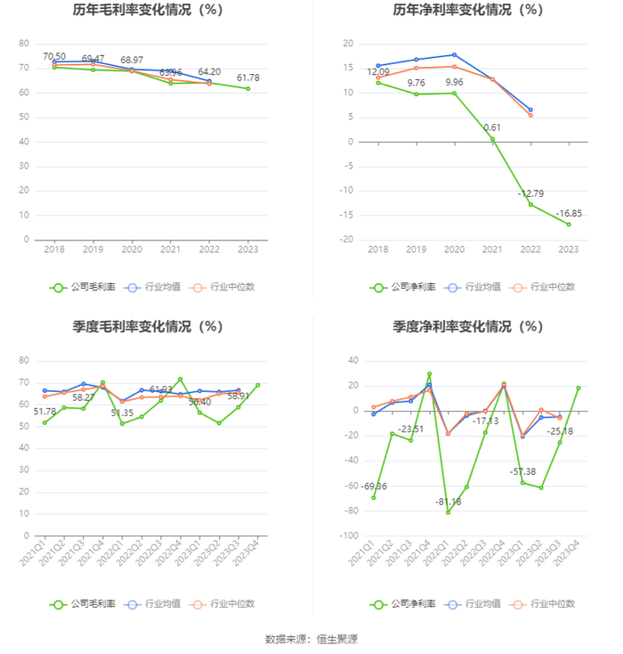 2023年,公司毛利率为61.78%,同比下降2.42个百分点;净利率为-16.85%,较上年同期下降4.06个百分点。从单季度指标来看,2023年第四季度公司毛利率为68.99%,同比下降2.72个百分点,环比上升10.08个百分点;净利率为18.39%,较上年同期下降3.47个百分点,较上一季度上升43.57个百分点。