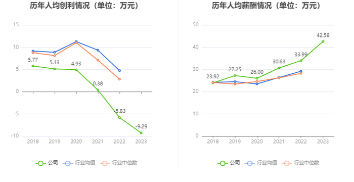 截至2023年末,公司员工总数为3874人,人均创收56.02万元,人均创利-9.29万元,人均薪酬42.58万元,较上年同期分别变化23.07%、-59.34%、25.29%。