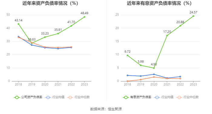 在偿债能力方面,公司2023年年末资产负债率为48.49%,相比上年末上升6.79个百分点;有息资产负债率为24.57%,相比上年末上升3.69个百分点。