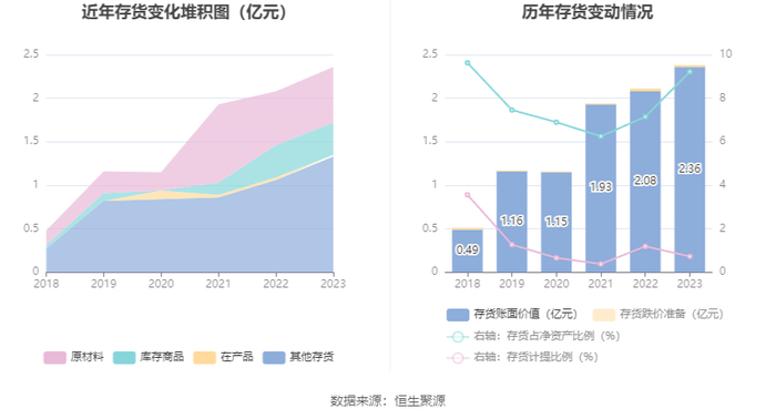 从存货变动来看,截至2023年年末,公司存货账面价值为2.36亿元,占净资产的9.22%,较上年末增加2825.75万元。其中,存货跌价准备为172.97万元,计提比例为0.73%。