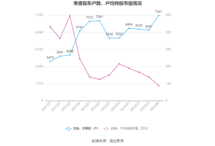 筹码集中度方面,截至2023年年末,公司股东总户数为7541户,较三季度末增长了1300户,增幅20.83%;户均持股市值由三季度末的181.89万元下降至116.11万元,降幅为36.16%。