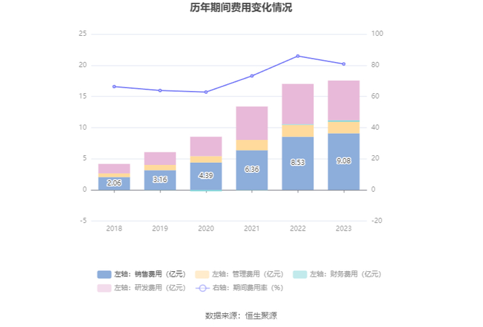 2023年,公司期间费用为17.54亿元,较上年同期增加5315.92万元;但期间费用率为80.84%,较上年同期下降5.08个百分点。其中,销售费用同比增长6.47%,管理费用同比下降3.58%,研发费用同比下降1.44%,财务费用同比增长131.14%。