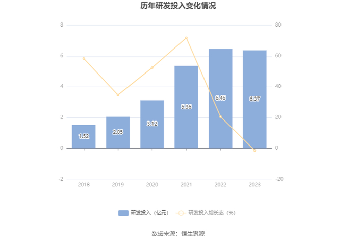 2023年全年,公司研发投入金额为6.37亿元,同比下降1.44%;研发投入占营业收入比例为29.33%,相比上年同期下降3.29个百分点。此外,公司全年研发投入资本化率为0。