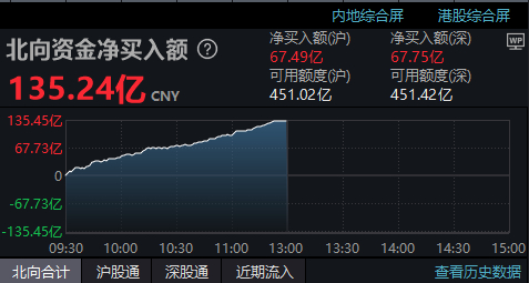 北向资金方面,上午半个交易日净买入约135亿元。