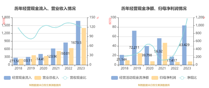2023年,公司营业收入现金比为119.17%,净现比为1163.54%。