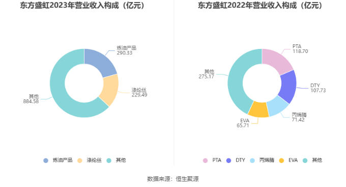 分产品来看,2023年公司主营业务中,炼油产品收入290.33亿元,同比增长1597.75%,占营业收入的20.67%;涤纶丝收入229.49亿元,同比增长20.97%,占营业收入的16.34%。