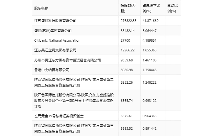 年报显示,2023年年末公司十大流通股东中,持股最多的为江苏盛虹科技股份有限公司,占比41.87%。十大流通股东名单相比2023年三季报维持不变。在具体持股比例上,江苏盛虹科技股份有限公司、盛虹(苏州)集团有限公司、江苏吴江丝绸集团有限公司、苏州市吴江东方国有资本投资经营有限公司、香港中央结算有限公司持股有所下降。