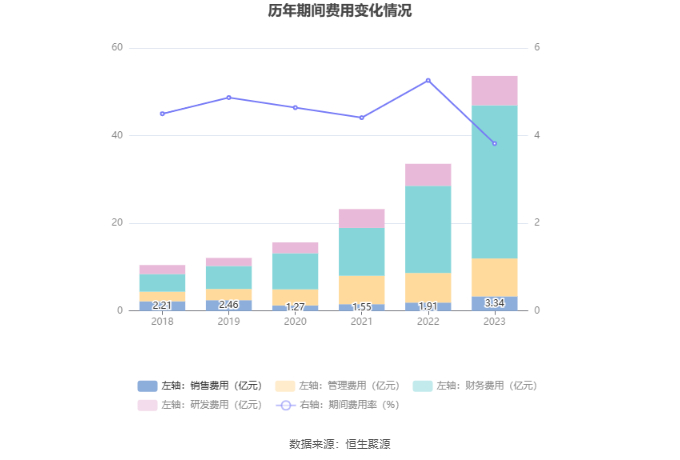 2023年,公司期间费用为53.64亿元,较上年同期增加20.05亿元;但期间费用率为3.82%,较上年同期下降1.44个百分点。其中,销售费用同比增长74.75%,管理费用同比增长27.84%,研发费用同比增长33.46%,财务费用同比增长75.73%。