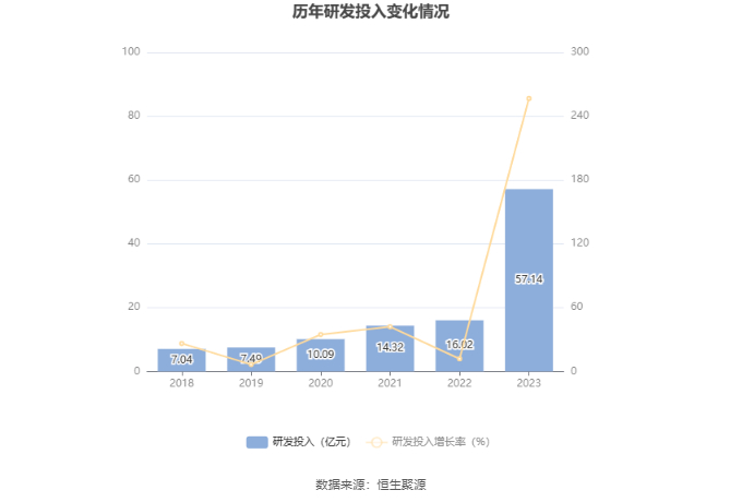 2023年全年,公司研发投入金额为57.14亿元,同比增长256.69%;研发投入占营业收入比例为4.07%,相比上年同期上升1.56个百分点。此外,公司全年研发投入资本化率为0。