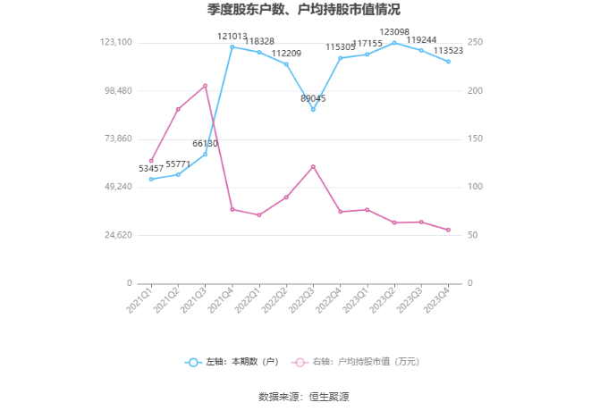 筹码集中度方面,截至2023年年末,公司股东总户数为11.35万户,较三季度末下降了5721户,降幅4.80%;户均持股市值由三季度末的64.04万元下降至55.91万元,降幅为12.70%。