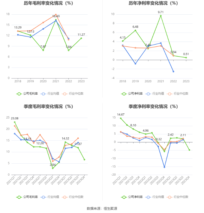 2023年,公司毛利率为11.27%,同比上升3.43个百分点;净利率为0.51%,较上年同期下降0.43个百分点。从单季度指标来看,2023年第四季度公司毛利率为6.64%,同比上升1.17个百分点,环比下降5.23个百分点;净利率为-4.80%,较上年同期上升0.88个百分点,较上一季度下降6.91个百分点。