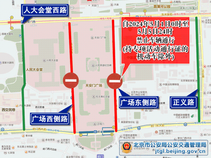 特别提示:5月1日0时至5月5日24时,天安门广场东侧路、天安门广场西侧路禁止车辆通行,过往车辆可绕行正义路和人大会堂西路。