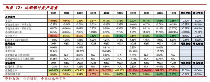 总体指标多维度看:1、不良维度——不良率持续降低。1Q24成都银行不良率0.66%,环比下降2bp,累计年化不良净生成率下降43bp至-0.25%,资产质量保持非常优秀的水平。未来不良压力方面,关注类贷款占比0.41%,环比持平,保持在较低水平。2、逾期维度——逾期率继续下降。2023年末逾期率较年初下行1bp至0.80%,继续保持下行态势。3、拨备维度——拨备保持在较高水平。拨备覆盖率环比下降0.54个百分点至503.75%,保持较高水平;拨贷比环比下行9bp至3.33%。
