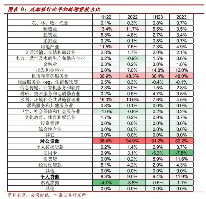 信贷投向分析:从2023全年来看,成都银行新增主要由基建类贷款贡献,按揭回升带动零售信贷新增占比小幅提升。1、对公信贷新增占比较2022年下降5.7个百分点至89.2%,主要是基建类贷款投放贡献。2023年基建类贷款保持了较高的增长,新增基建类贷款占总新增贷款的比重为55.1%,是对公新增的主要力量。2、按揭投放有所回升,带动零售信贷新增占比有所提高。从全年来看,个人按揭贷款新增占比较年初上升2.3pct至3.7%;消费贷和信用卡占比提升0.4pct至3.8%;经营贷全年新增占比稳定在4.3%。