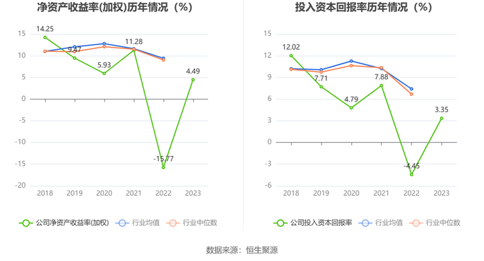 数据显示,2023年公司加权平均净资产收益率为4.49%,较上年同期增长20.26个百分点;公司2023年投入资本回报率为3.35%,较上年同期增长7.80个百分点。