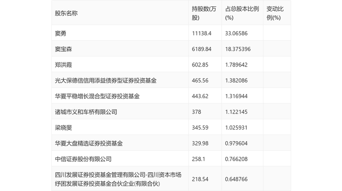 年报显示,2023年年末公司十大流通股东中,新进股东为华夏大盘精选证券投资基金、中信证券股份有限公司,取代了三季度末的李翠兰、张剑。在具体持股比例上,华夏平稳增长混合型证券投资基金持股有所上升,窦勇、窦宝森、郑洪霞、光大保德信信用添益债券型证券投资基金、诸城市义和车桥有限公司、梁晓斐、四川发展证券投资基金管理有限公司-四川资本市场纾困发展证券投资基金合伙企业(有限合伙)持股有所下降。