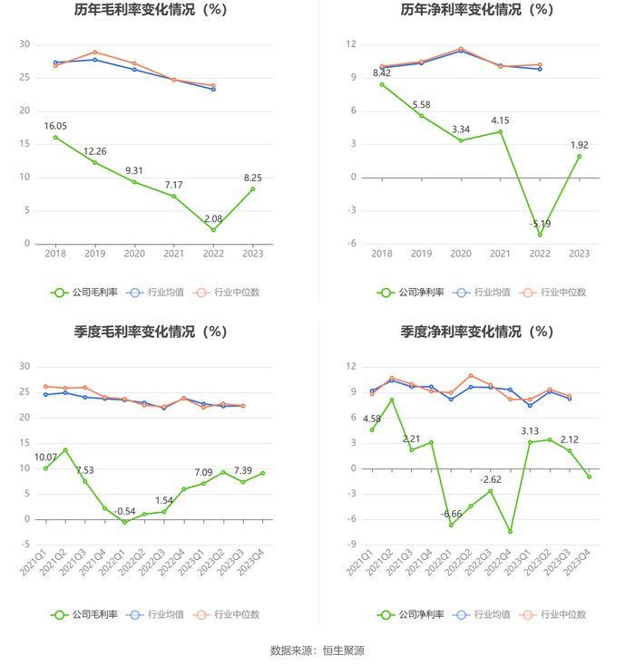 2023年,公司毛利率为8.25%,同比上升6.17个百分点;净利率为1.92%,较上年同期上升7.11个百分点。从单季度指标来看,2023年第四季度公司毛利率为9.14%,同比上升3.15个百分点,环比上升1.75个百分点;净利率为-0.95%,较上年同期上升6.49个百分点,较上一季度下降3.07个百分点。