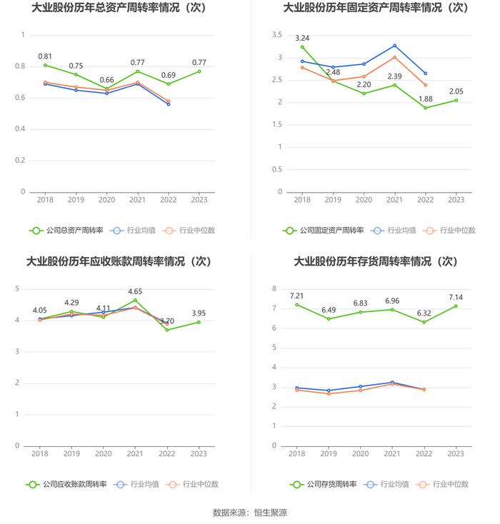 营运能力方面,2023年,公司公司总资产周转率为0.77次,上年同期为0.69次(2022年行业平均值为0.56次,公司位居同行业23/78);固定资产周转率为2.05次,上年同期为1.88次(2022年行业平均值为2.65次,公司位居同行业57/78);公司应收账款周转率、存货周转率分别为3.95次、7.14次。