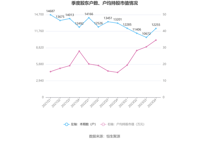 筹码集中度方面,截至2023年年末,公司股东总户数为1.23万户,较三季度末增长了1583户,增幅14.83%;户均持股市值由三季度末的30.58万元上升至34.63万元,增幅为13.24%。