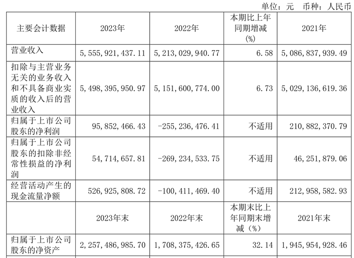 中证智能财讯 大业股份(603278)4月26日披露2023年年报。2023年,公司实现营业总收入55.56亿元,同比增长6.58%;归母净利润9585.25万元,同比扭亏;扣非净利润5471.47万元,同比扭亏;经营活动产生的现金流量净额为5.27亿元,上年同期为-1.00亿元;报告期内,大业股份基本每股收益为0.33元,加权平均净资产收益率为4.49%。公司2023年年度利润分配预案为:拟向全体股东每10股派0.35元(含税)。