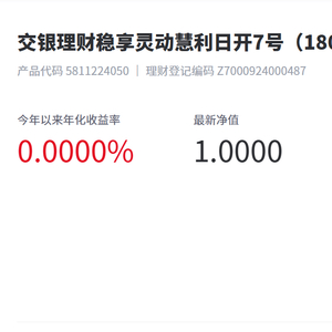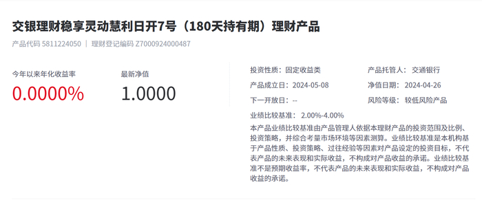 4月26日,据交银理财披露,该公司发行的稳享灵动慧利日开7号(180天持有期)理财产品募集期为2024年4月26日-2024年5月7日,投资起点金额为1元。该产品类型为固定收益类、非保本浮动收益型,产品风险评级为较低风险产品(R2)(本评级为交银理财内部评级,仅供参考),最低持有期180个自然日,业绩比较基准为2.00%/年-4.00%/年。