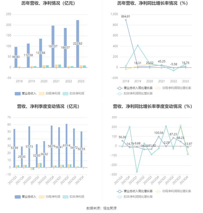 2023年,公司毛利率为-2.99%,同比上升0.50个百分点;净利率为48.50%,较上年同期上升24.22个百分点。从单季度指标来看,2023年第四季度公司毛利率为-0.36%,同比上升1.42个百分点,环比上升1.22个百分点;净利率为24.44%,较上年同期上升3.09个百分点,较上一季度上升11.09个百分点。