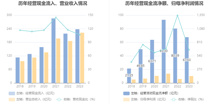 2023年,公司经营活动现金流净额为67.63亿元,同比下降15.87%;筹资活动现金流净额-38.51亿元,同比减少58.88亿元;投资活动现金流净额-47.48亿元,上年同期为-82.28亿元。