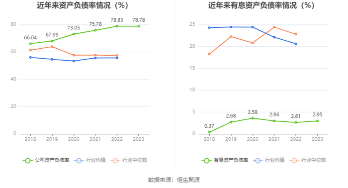 在偿债能力方面,公司2023年年末资产负债率为78.78%,相比上年末下降0.05个百分点;有息资产负债率为2.95%,相比上年末上升0.34个百分点。