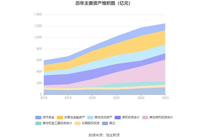 资产重大变化方面,截至2023年年末,公司其他债权投资合计较上年末增加40.66%,占公司总资产比重上升7.36个百分点;交易性金融资产较上年末减少8.93%,占公司总资产比重下降3.34个百分点;货币资金较上年末减少14.02%,占公司总资产比重下降2.32个百分点;其他流动资产较上年末减少6.07%,占公司总资产比重下降1.64个百分点。