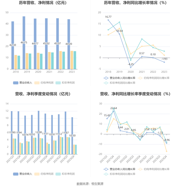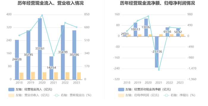2023年,公司经营活动现金流净额为58.42亿元,同比下降10.89%;筹资活动现金流净额-6.92亿元,同比增加81.15亿元;投资活动现金流净额-71.88亿元,上年同期为27.12亿元。