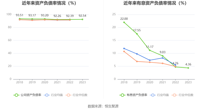 在偿债能力方面,公司2023年年末资产负债率为92.54%,相比上年末上升0.15个百分点;有息资产负债率为4.36%,相比上年末下降0.40个百分点。