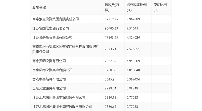 年报显示,2023年年末公司十大流通股东中,持股最多的为南京紫金投资集团有限责任公司,占比8.96%。十大流通股东名单相比2023年三季报维持不变。在具体持股比例上,南京凤南投资实业有限公司持股有所上升,南京紫金投资集团有限责任公司、江苏省国信集团有限公司、江苏苏豪投资集团有限公司、香港中央结算有限公司持股有所下降。