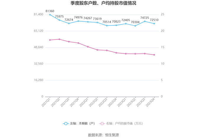 筹码集中度方面,截至2023年年末,公司股东总户数为7.25万户,较三季度末下降了2215户,降幅2.96%;户均持股市值由三季度末的13.13万元下降至12.77万元,降幅为2.74%。