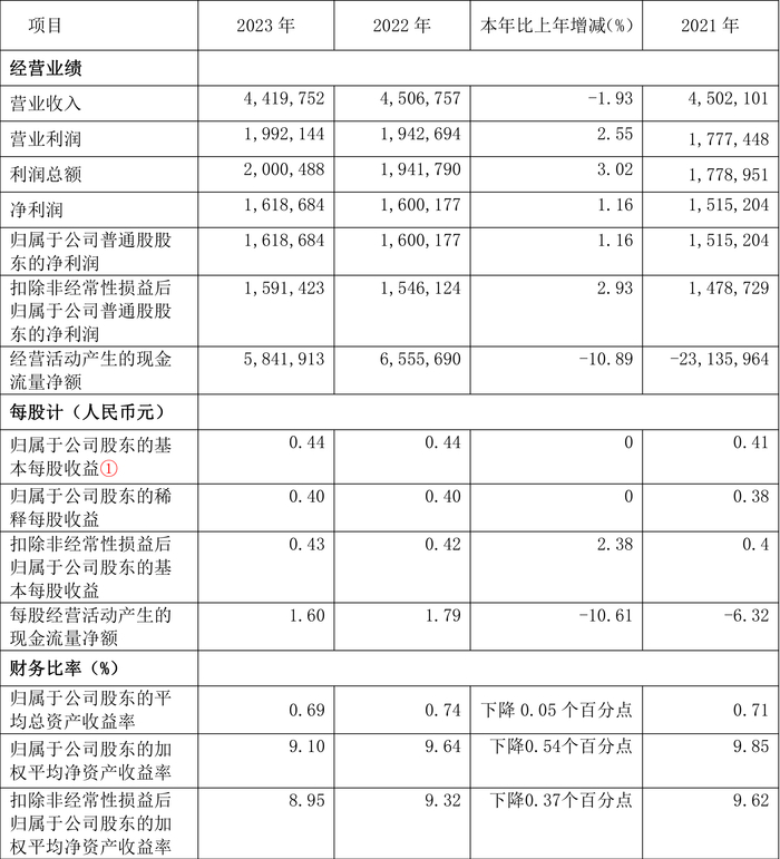 中证智能财讯 紫金银行(601860)4月26日披露2023年年报。2023年,公司实现营业总收入44.20亿元,同比下降1.93%;归母净利润16.19亿元,同比增长1.16%;扣非净利润15.91亿元,同比增长2.93%;经营活动产生的现金流量净额为58.42亿元,同比下降10.89%;报告期内,紫金银行基本每股收益为0.44元,加权平均净资产收益率为9.10%。公司2023年年度利润分配预案为:拟向全体股东每10股派1元(含税)。