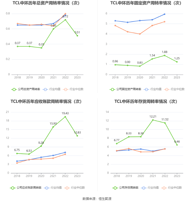 营运能力方面,2023年,公司公司总资产周转率为0.51次,上年同期为0.72次(2022年行业平均值为0.78次,公司位居同行业34/63);固定资产周转率为1.25次,上年同期为1.88次(2022年行业平均值为5.95次,公司位居同行业56/63);公司应收账款周转率、存货周转率分别为12.83次、6.46次。