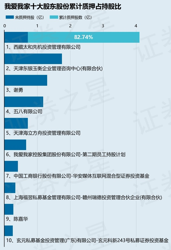 截止本公告日,股东西藏太和先机投资管理有限公司已累计质押股份3.4亿股,占其持股总数的82.74%。本次质押后我爱我家十大股东的累计质押股份占持股比例见下图: