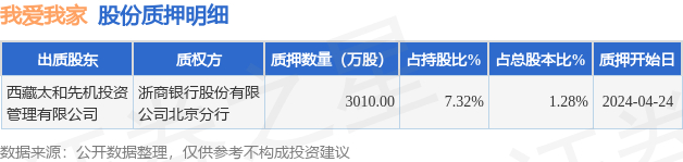 我爱我家(000560)股东西藏太和先机投资管理有限公司质押3010万股,占总股本1.28%