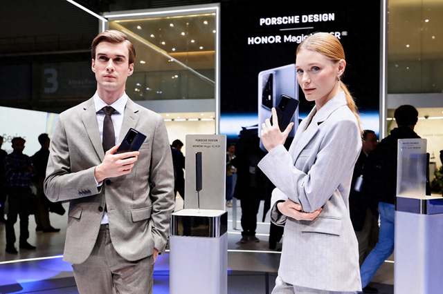 当地时间2024年4月2日,西班牙巴塞罗那,在2024年世界移动通信大会上,模特展示中国公司与德国汽车制造商保时捷合作生产的可折叠智能手机“荣耀Magic V2 RSR 保时捷设计”。图片来源:视觉中国