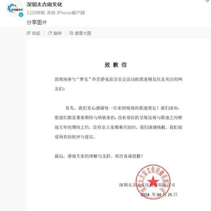 4月26日,就许美静见面音乐会相关争议,主办方@深圳太古宙文化 发布致歉信。
