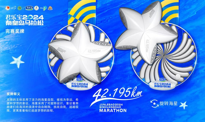 秦皇岛马拉松的奖牌设计独具匠心,采用了海星造型,将赛事的海洋风情和活力特质完美融合。海星被视为幸运、希望和梦想的象征,每一枚奖牌都如同一颗闪耀的星星,象征着选手们在赛场上的耀眼表现和无尽的潜力。奖牌创意性采用了可旋转设计,象征着奔跑者们在马拉松的旅程中乘风破浪自由翱翔。背面沿用秦皇岛海岸线设计,整个奖牌背景以蓝色为主色调,与秦皇岛马拉松的主视觉完美呼应,展现出海洋的深邃与宽广,让人联想到碧海蓝天,激发着人们追逐梦想的热情和勇气。