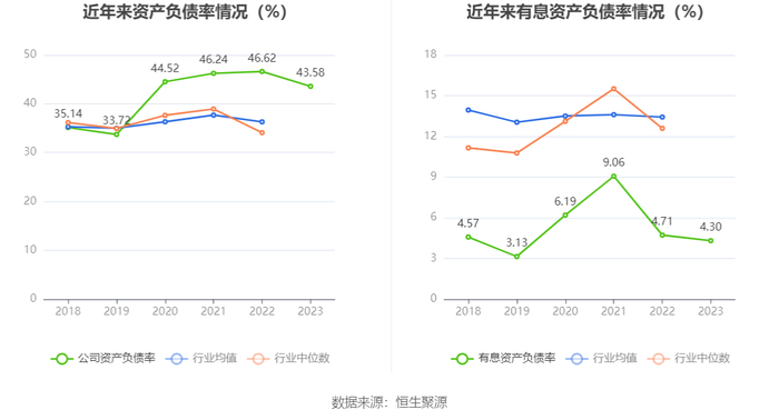在偿债能力方面,公司2023年年末资产负债率为43.58%,相比上年末下降3.04个百分点;有息资产负债率为4.30%,相比上年末下降0.41个百分点。