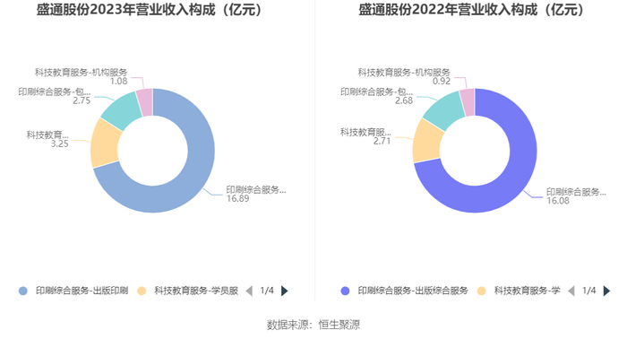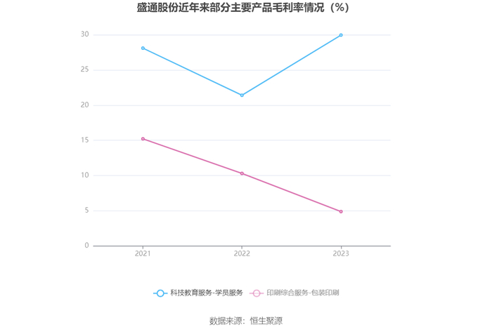 分产品看,印刷综合服务-出版印刷、科技教育服务-学员服务、印刷综合服务-包装印刷2023年毛利率分别为11.48%、29.95%、4.89%。