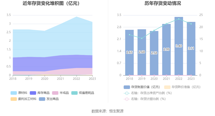 从存货变动来看,截至2023年年末,公司存货账面价值为3.11亿元,占净资产的21.4%。根据财报,公司本期没有计提存货跌价准备。
