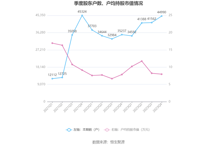 筹码集中度方面,截至2023年年末,公司股东总户数为4.5万户,较三季度末增长了3428户,增幅8.25%;户均持股市值由三季度末的8.24万元下降至7.97万元,降幅为3.28%。