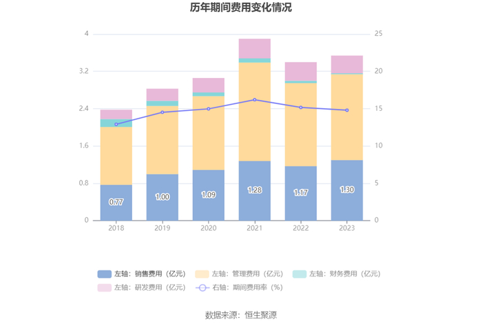 2023年,公司期间费用为3.55亿元,较上年同期增加1504.35万元;但期间费用率为14.81%,较上年同期下降0.37个百分点。其中,销售费用同比增长11.35%,管理费用同比增长3.46%,研发费用同比下降5.12%,财务费用同比下降50.5%。