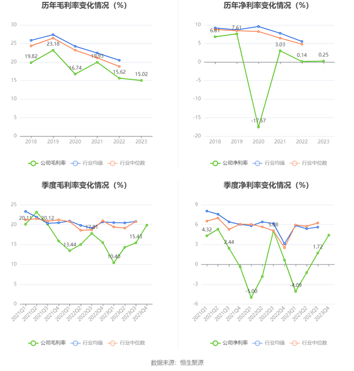 2023年,公司毛利率为15.02%,同比下降0.60个百分点;净利率为0.25%,较上年同期上升0.11个百分点。从单季度指标来看,2023年第四季度公司毛利率为19.88%,同比上升4.38个百分点,环比上升4.45个百分点;净利率为4.42%,较上年同期上升3.78个百分点,较上一季度上升2.70个百分点。