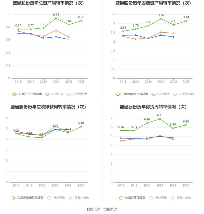 营运能力方面,2023年,公司公司总资产周转率为0.90次,上年同期为0.84次(2022年行业平均值为0.61次,公司位居同行业11/47);固定资产周转率为3.14次,上年同期为2.93次(2022年行业平均值为2.27次,公司位居同行业15/47);公司应收账款周转率、存货周转率分别为5.18次、6.25次。
