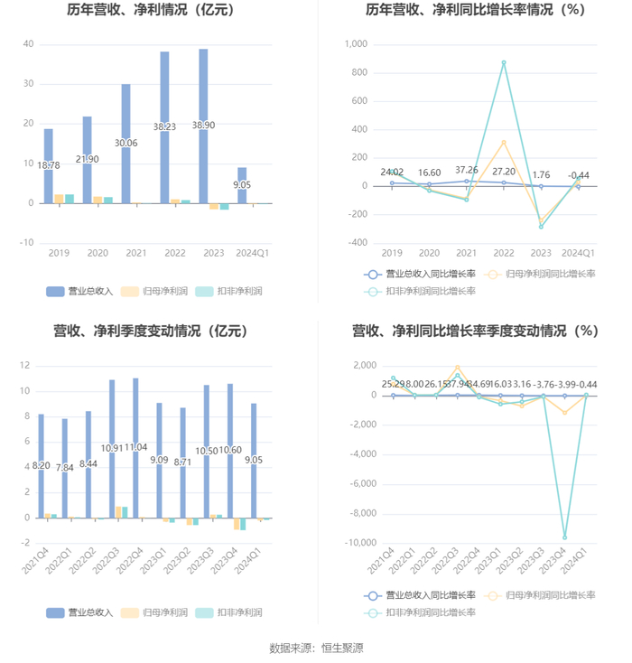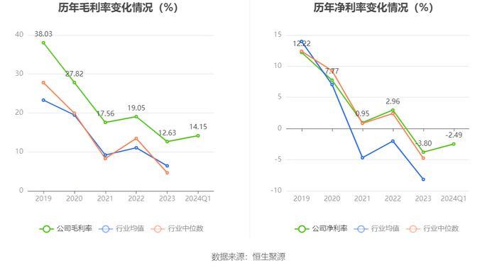 2024年第一季度,公司毛利率为14.15%,同比上升3.30个百分点;净利率为-2.49%,较上年同期上升0.73个百分点。