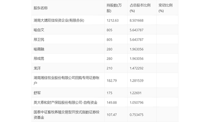 一季报显示,2024年一季度末公司十大流通股东中,新进股东为湖南湘佳牧业股份有限公司回购专用证券账户、国泰中证畜牧养殖交易型开放式指数证券投资基金,取代了上年末的英大泰和人寿保险股份有限公司-个险万能、杨全珍。在具体持股比例上,湖南大靖双佳投资企业(有限合伙)、喻自文、邢卫民、喻薇融、邢成男、龙洋、舒军、英大泰和财产保险股份有限公司-自有资金持股有所下降。